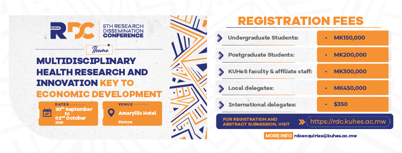 Join us as we bring together leading experts, researchers, and stakeholders to explore the latest advancements, share insights, and address the challenges facing the healthcare industry. This year marks our fourth Research Dissemination Conference (RDC), scheduled to take place from 30th September to 2nd October 2026 at Amaryllis Hotel in Blantyre, Malawi. Through a diverse program featuring keynote addresses, panel discussions, oral and poster presentations, the KUHeS RDC provides a platform for interdisciplinary dialogue and collaboration.